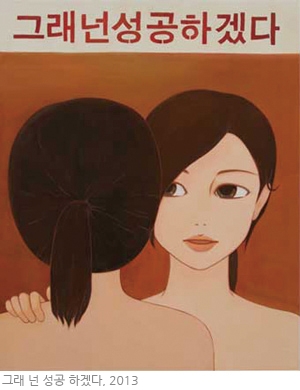 <그래 넌 성공하겠다>는 누구를 향한 말일까? 거울 속 자신을 향한 응원일까, 친구에 대한 질투일까, 아니면 누군가에 대한 비아냥일까. 그림 속 여성들은 화면 밖을 향해있지만 그들의 눈빛은 묘하게 생기가 없다. 슬퍼서 엉엉 우는 모습도 즐거워 크게 웃는 것도 아니다. 알 듯 말 듯 무표정에 가까운 얼굴로 우리를 응시한다. 그 응시는 작품을 이루는 텍스트를 그들이 하는 말처럼 만든다. 차갑고 세련된 광고처럼 사진 이미지와 문구를 병치했던 바바라 크루거(Barbara Kruger)의 작품과는 다른 매력이다. 직접적이고 공격적이기보단 소극적인 독백처럼 다가온다. 누군가의 혹은 어쩌면 우리 모두의 마음 속 깊은 곳에 자리한, 아무에게도 들키고 싶지 않은 불안과 좌절, 갈망과 욕망들이 하소연처럼 떠다니는 문구가 되어 우리에게 와 부딪힌다. <시집이나 갈까>, <커피숍 차릴 거야>, <어차피 너희는 나한테 관심도 없잖아>와 같은 작품에서는 한탄 어린 푸념과 부러움, 관심과 위로를 받고 싶지만 아무도 알아주지 않는 현실에 대한 서운함과 원망 같은 것들이 묻어난다. 그럼에도 불구하고 약해지지 않으려, 선글라스로 얼굴을 가리고 <나는 친구가 많아>라며 애써 괜찮은 척하지만 흐르는 눈물까지 숨기진 못한다.