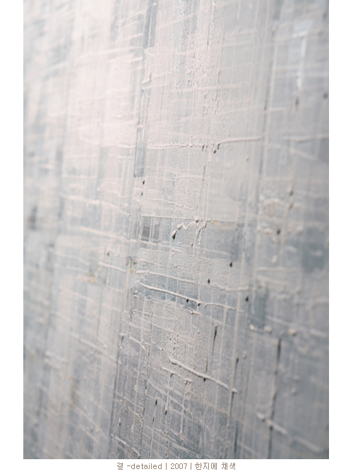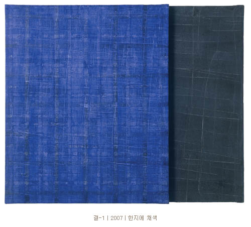 현대인의 부조화-추상 : 그녀의 <결>시리즈가 40대에는 색이나 먹의 감성적 표현과 구성에 집중해왔다면, 이번 전시는 다음 두 가지 점에서 차별화된다. 하나는 이제까지 주(主)였던 하늘의 색인, 검은 현색 바탕에 흰 호분에 의한 ‘결’이 기하학화 되어, 흑․백, 그리고 청․ 홍(紅)으로 일정한, 그러나 굵은 수평선․ 수직선 안에서, 또는 전면에 걸쳐서 자기주장을 강하게 하거나, 최근에 올수록 흑(黑)이 전 화면을 다시 덮어, 오염된 서울 밤하늘에서의 별처럼 잠깐잠깐 비칠 정도에 불과하다. 즉 그 많은 붓질에도 자세히 보지 않으면 느끼지 못할 정도가 되었다. 나무결이나 창호지의 결이 자세히 보아야 알 수 있듯이, 그녀의 ‘결’은 가까이에서 자세히 보아야 그 주도성을 획득한다.