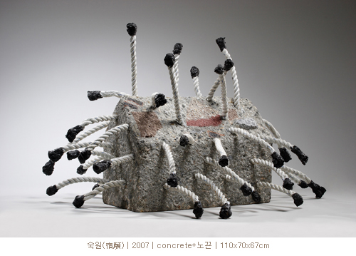 이외에도 작가는 집 형상의 바깥쪽으로 여러 크고 작은 노끈들이 노출돼 있는 일련의 작업들을 제안한다. 노끈들이 거푸집을 관통하도록 배열하고 이를 시멘트와 함께 굳힌 연후에 집 모양으로 시멘트를 털어낸 것이다. 이들 작업에서의 집 역시 작가의 자기 정체성을 상징하며 그 외부로 향한 끈들은 타자와의 관계를, 인연을 상징한다. 자기 혼자만으로는 살 수 없는, 타자와 더불어 살아갈 수밖에 없는 삶의 속성을 비유적으로 표현한 것이다. 그 관계의 끈은 나에게 호의적으로 작용하기도 하고 나아가 나를 깨우쳐주기도 하지만, 많은 경우에 있어서 나를 피폐하게 하기도 한다. 때로 나는 속수무책으로 엉클어져 있는 실타래(노끈뭉치)처럼 그 관계를 버거워하기조차 한다. 우무길의 작업에서 주체와 타자와의 관계는 이처럼 집 밖으로 연결된 노끈으로도 표현되고 있으며, 특히 집과 또 다른 집을 하나로 이어주는 끈에서 그 점이 더욱 분명해진다. 그 자체를 타자와의 연속성에 대한 인식으로 읽을 수 있는 것이다.