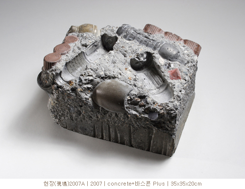 작가는 여기서 더 나아가 일종의 거푸집 형태의 박스를 만들고는, 그 속을 이 유사물체들과 함께 시멘트로 채워 넣어 굳힌다. 이로써 거푸집을 떼어내면 사각형태의 단단한 구조물이 드러난다. 이제부터 그 속에 숨겨진 유사물체들을 찾아나가는(발굴하는) 과정이 수행되는데, 처음에는 전동 드릴로 그 대략적인 윤곽이 드러나게 한 연후에 정으로 그 세부를 다듬는 식으로 형태를 찾아낸다. 이때 유사물체를 만들 때 사용된 시멘트와 거푸집을 만들 때 사용된 시멘트의 강도가 서로 다른 탓에 원형 그대로를 복원해낼 수 있게 된다.