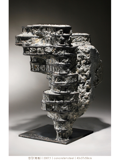 급격하게 생성되고 사라지기를 반복하는 현대문명에 대한 아쉬움을 먼 미래에 발굴된 건축물 형태의 조각으로 표현한 작품소개