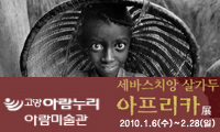 다큐멘터리 사진계의 살아있는 전설인 세바스치앙 살가두의 최신 작품 시리즈를 총망라한 작품전이 고양아람누리 아람미술관에서 펼쳐진다. 치밀한 취재와 아름다운 사진으로 1970년대 후반부터 세계의 포토저널리즘을 선두해 온 그가 사진가가 되고 난 후부터 지금까지 계속 촬영해온 아프리카 사진 중에서 100점을 엄선하였다. 그의 작품은 30년 간 아프리카에서 일어난 사건들을 알리는 귀중한 증언 자료가 된다. 특히, 이번 전시회는 2004년부터 10년에 걸친 계획 속에서 취재 중인
