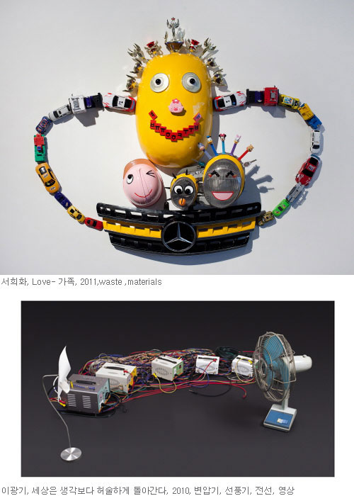 작가 서희화의 작품은 정크라 하기 어려울 정도로 아름답다. 버려진 플라스틱 쪼가리, 인형 등이 여러 방법으로 조합되고 채색되면서 원래의 기물적 속성은 사라지고 엉뚱하고 기발한 하나의 새로운 사물이 드러난다. 작가만의 뛰어난 해학적 표현은 공터의 잡동사니마저 사랑스러운 오브제로 탈바꿈 시키는데, 변용이 너무 신선해서 그 변화가 보여주는 사실관계의 왜곡은 미처 생각나지 않게 만들 정도다. 폐기된 욕망에서도 희망적 기운을 끌어내는 작가의 힘이 감탄스럽다.