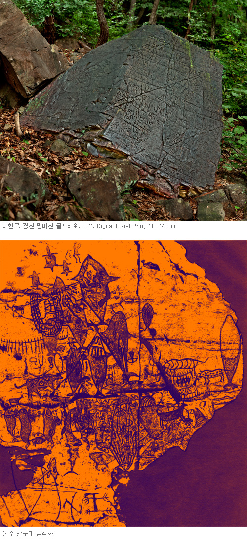 ■ 이번 전시에서 신범순 교수는 경상대 일대의 암각화, 거석 유적을 새로운 시각에서 접근한다. 울주 반구대암각화와 천전리 서석(태화문명), 경산의 명마산 거석유적(명마문명), 포항의 곤륭산 암각화와 오봉산 일대의 거석유적(칠포문명)이 그것이다. 이들 거석유적이 가진 놀라울 정도로 정교한, 유기적이고 기하학적인 구조를 주목하는 신범순 교수는 이들 거석 유적이 가진 테크놀로지와 문명의 상태를 독특한 관점으로 해석한다.